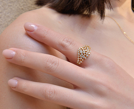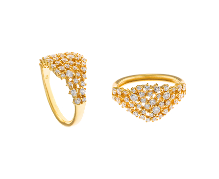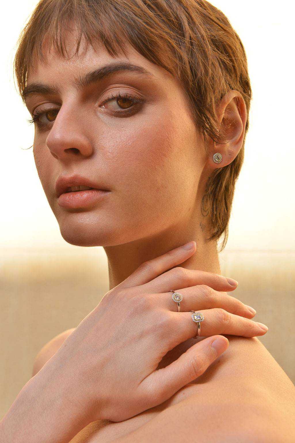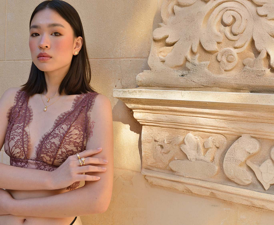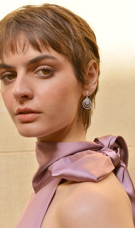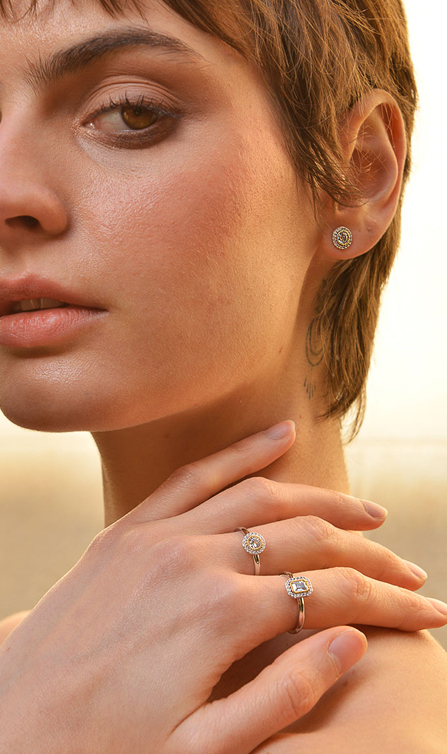 En su versión más delicada, Astral juega con baños mixtos de oro y rodio, creando piezas finísimas de pendientes, colgantes y anillos, donde la luz y la forma dialogan en perfecta armonía.
