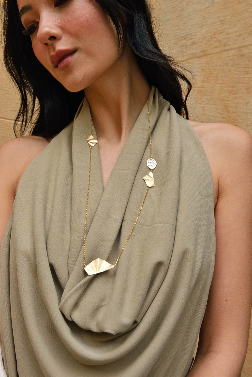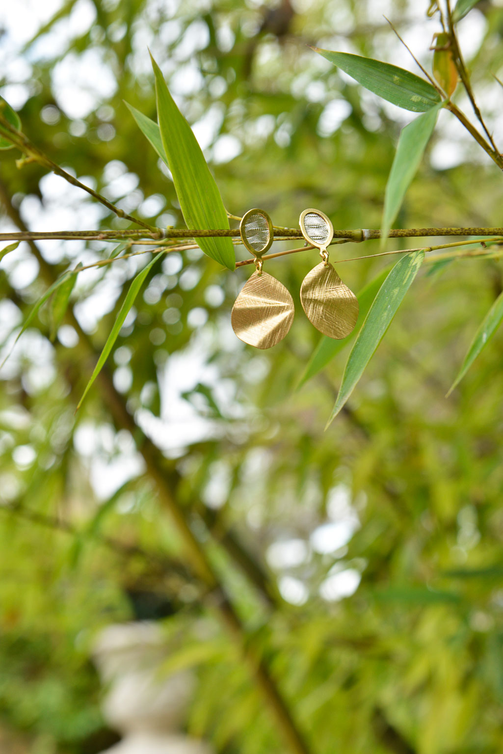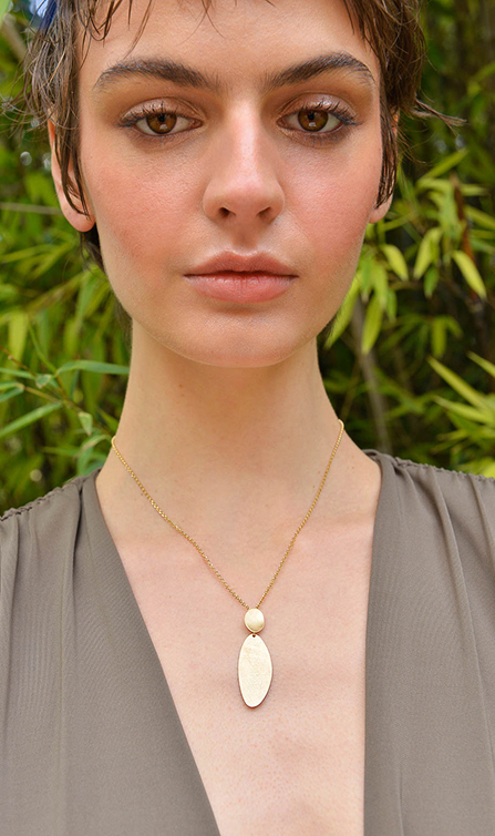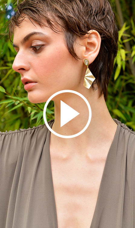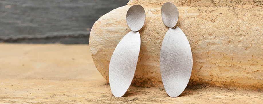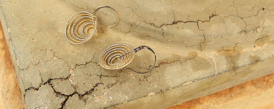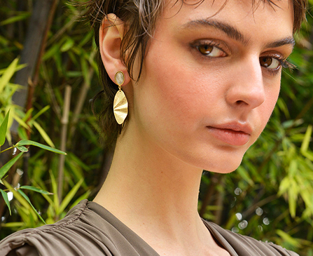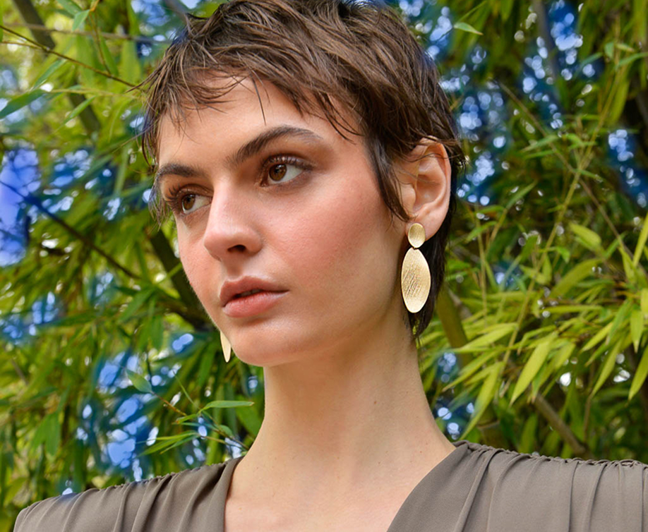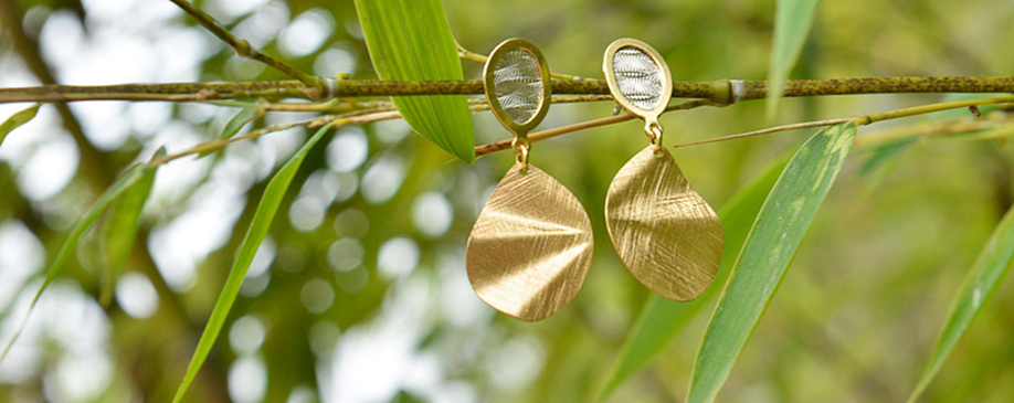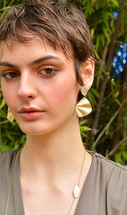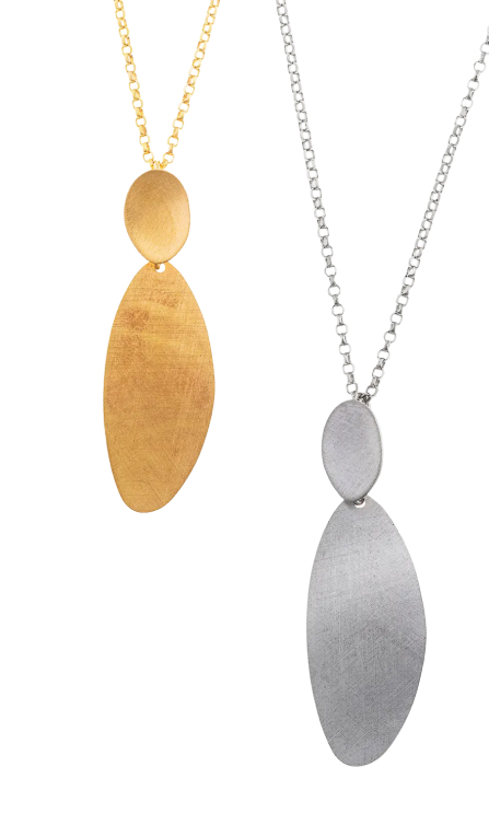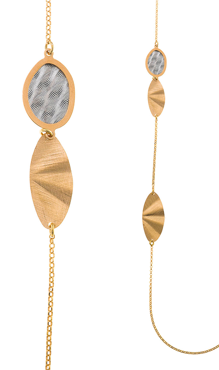 La segunda línea combina finas láminas de plata bañada en oro con acabado cepillado en pendientes geométricos y collares largos con formas muy orgánicas, con detalles en rodio con un diamantado muy especial.