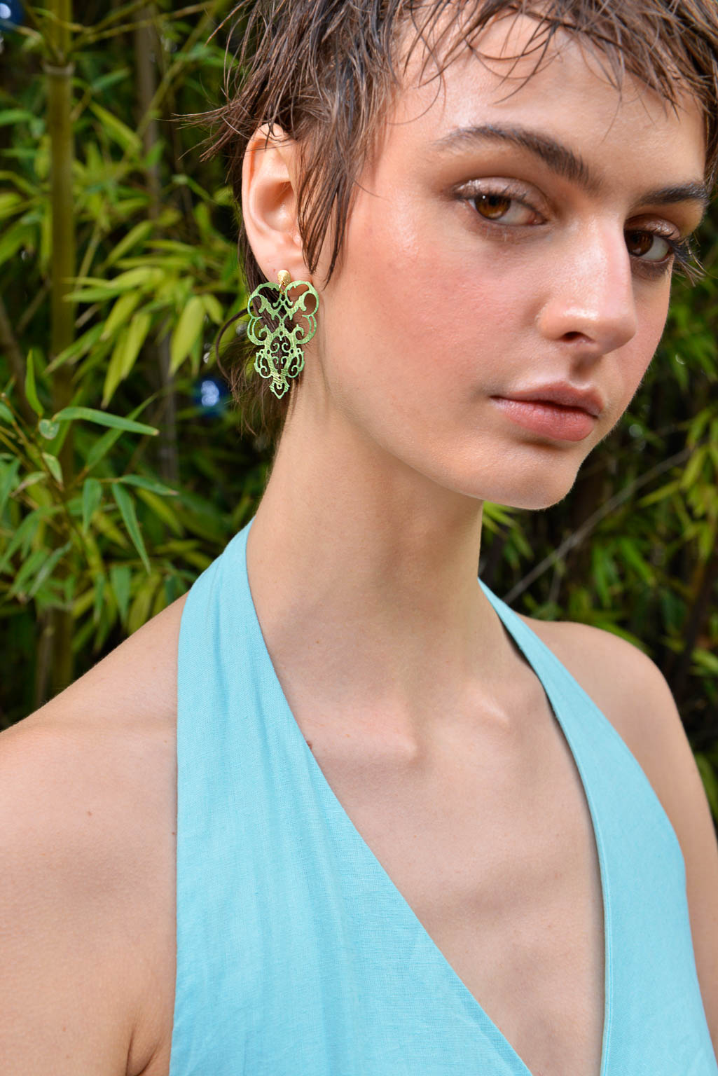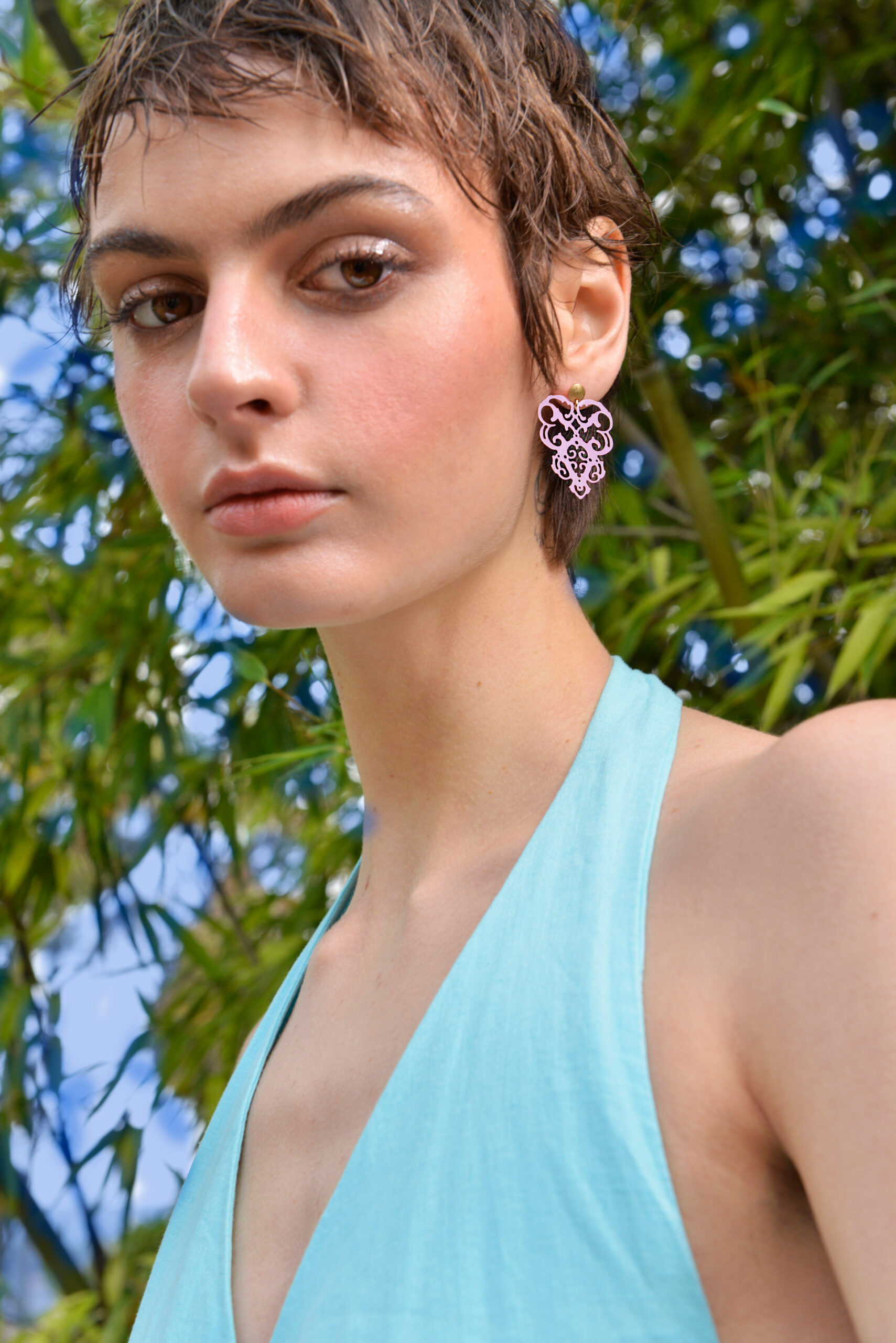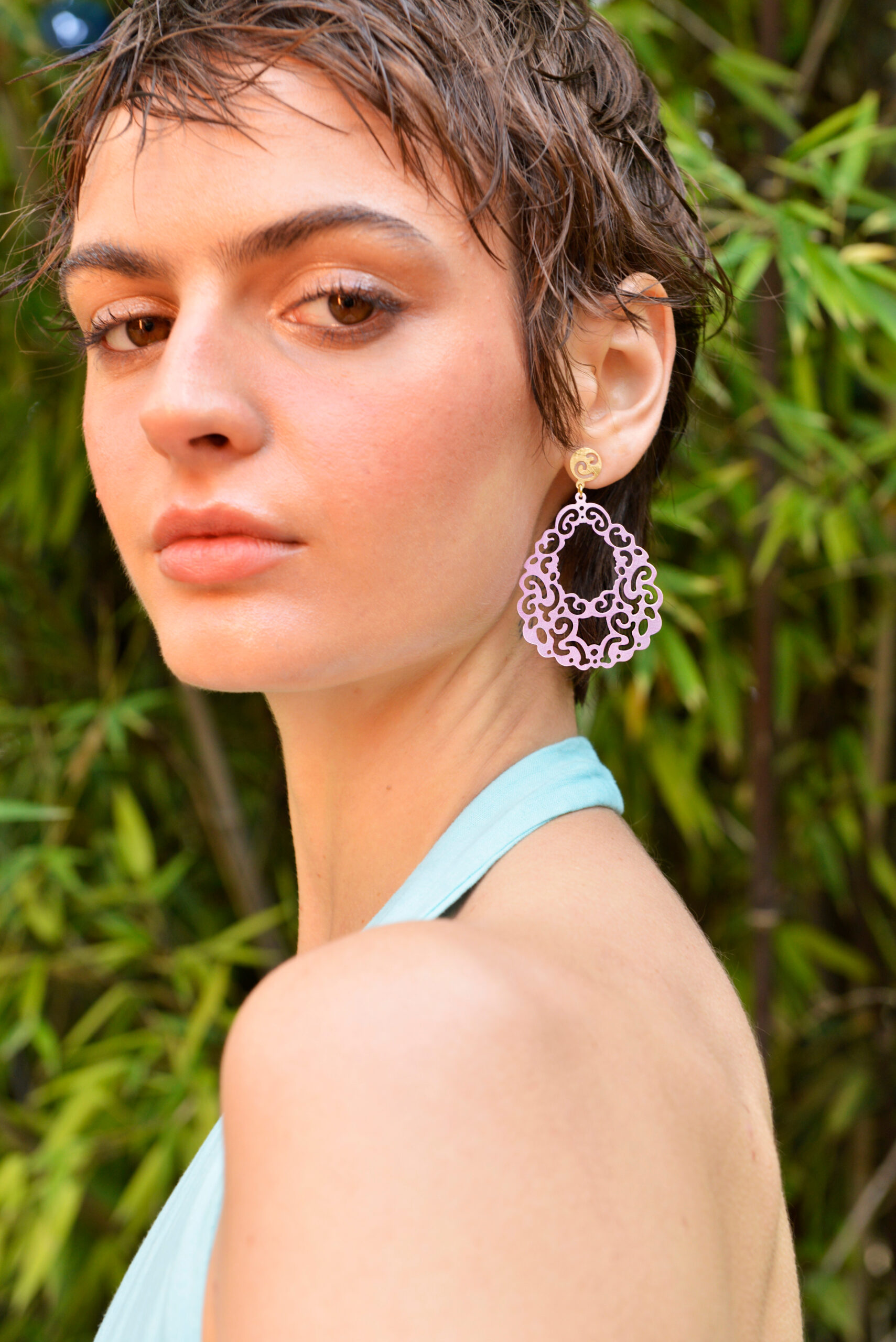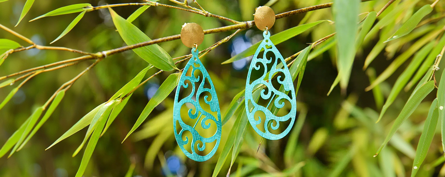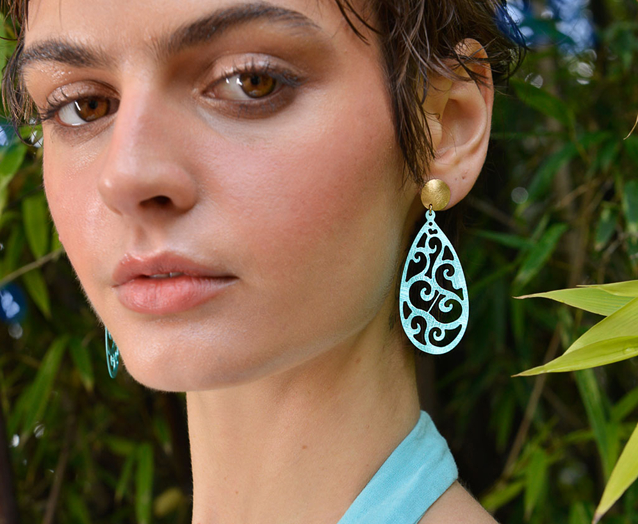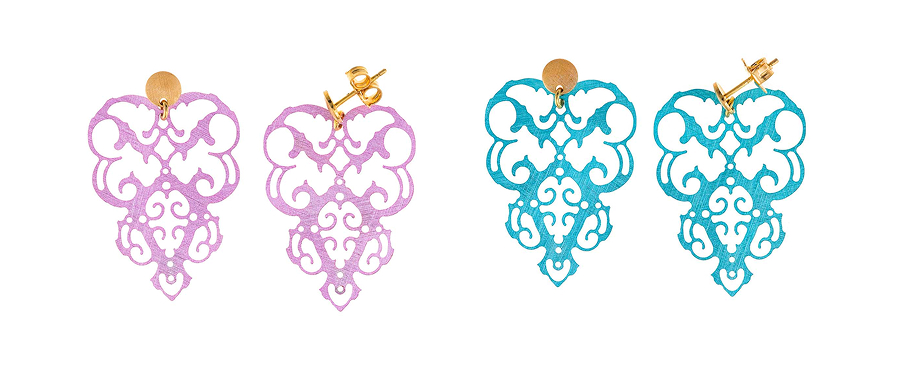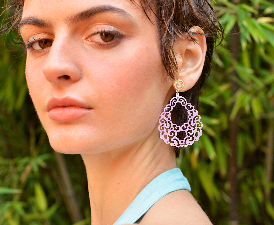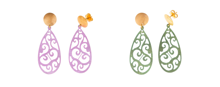 Los pendientes de plata de ley bañados en oro y esmaltados en tonos pastel; rosa suave, turquesa delicado y verde menta, evocan los brocados y encajes de las sedas orientales, donde cada color y cada trazo parecen tejidos con luz y movimiento.