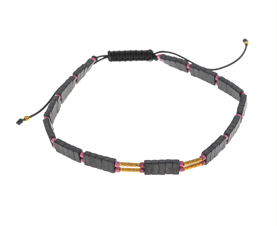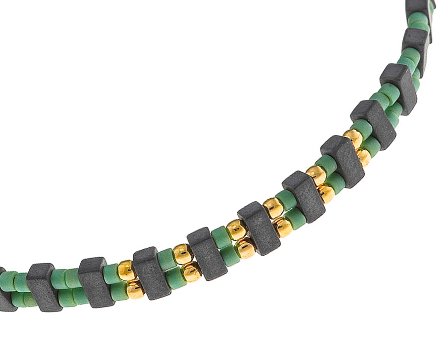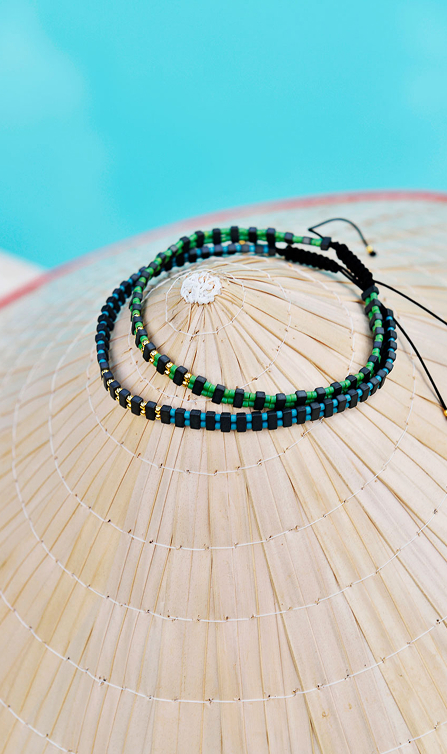 La gran novedad llega con las pulseras Glass, disponibles en dos tamaños, donde el negro profundo del cristal tallado en pequeños rectángulos se mezcla con pequeñas piedras naturales como sodalitas azules, hematita, esmeraldas y rubies con detalles de plata de ley bañados en oro. Un contraste que recuerda al brillo mineral de las rocas volcánicas al caer el sol: sobriedad, fuerza y un punto de misterio que eleva cualquier look estival.