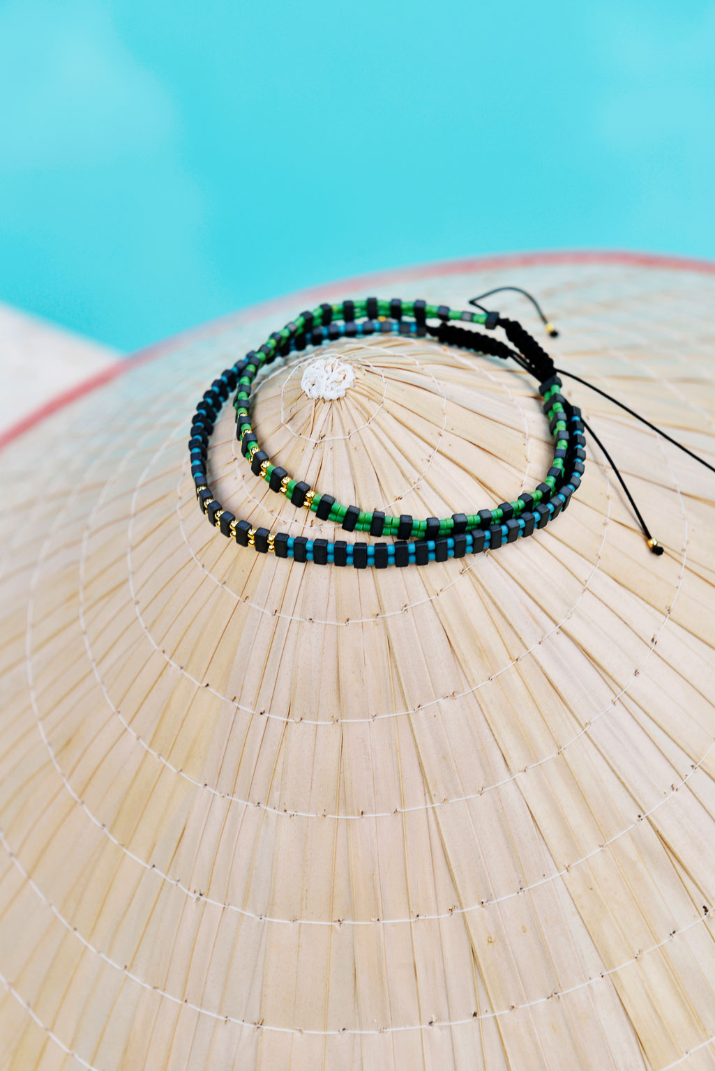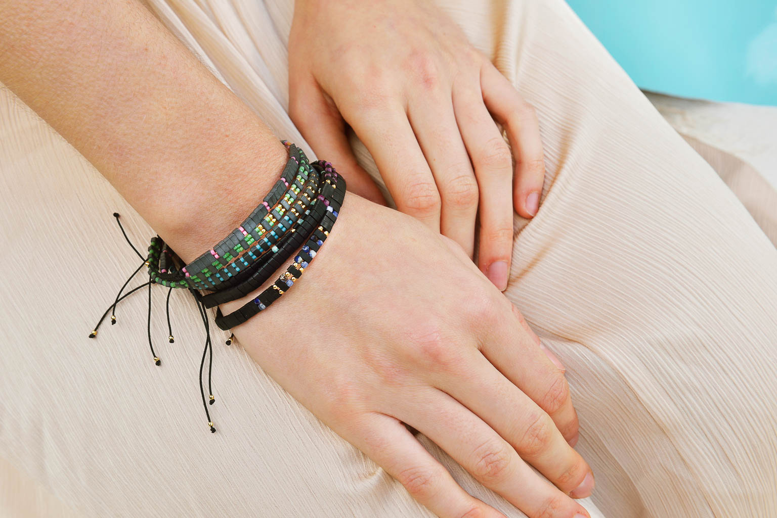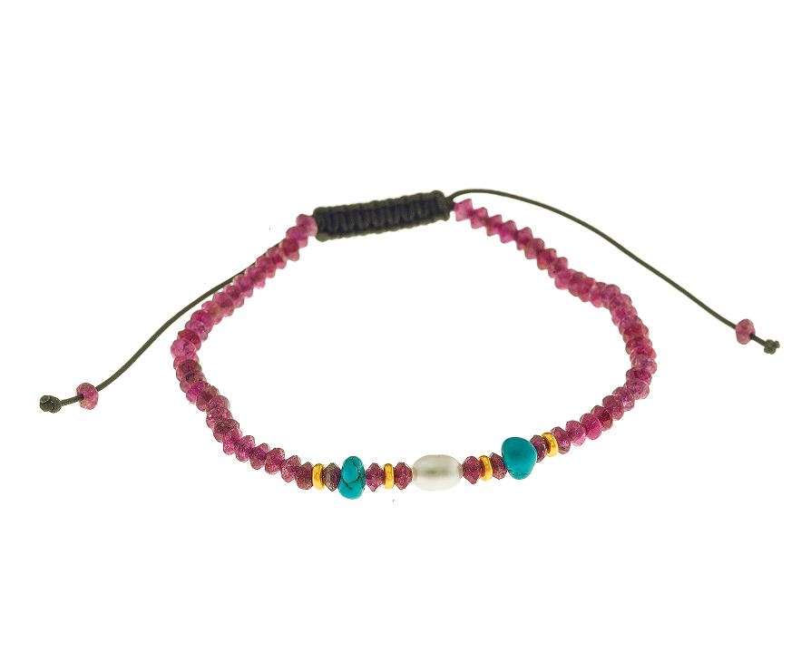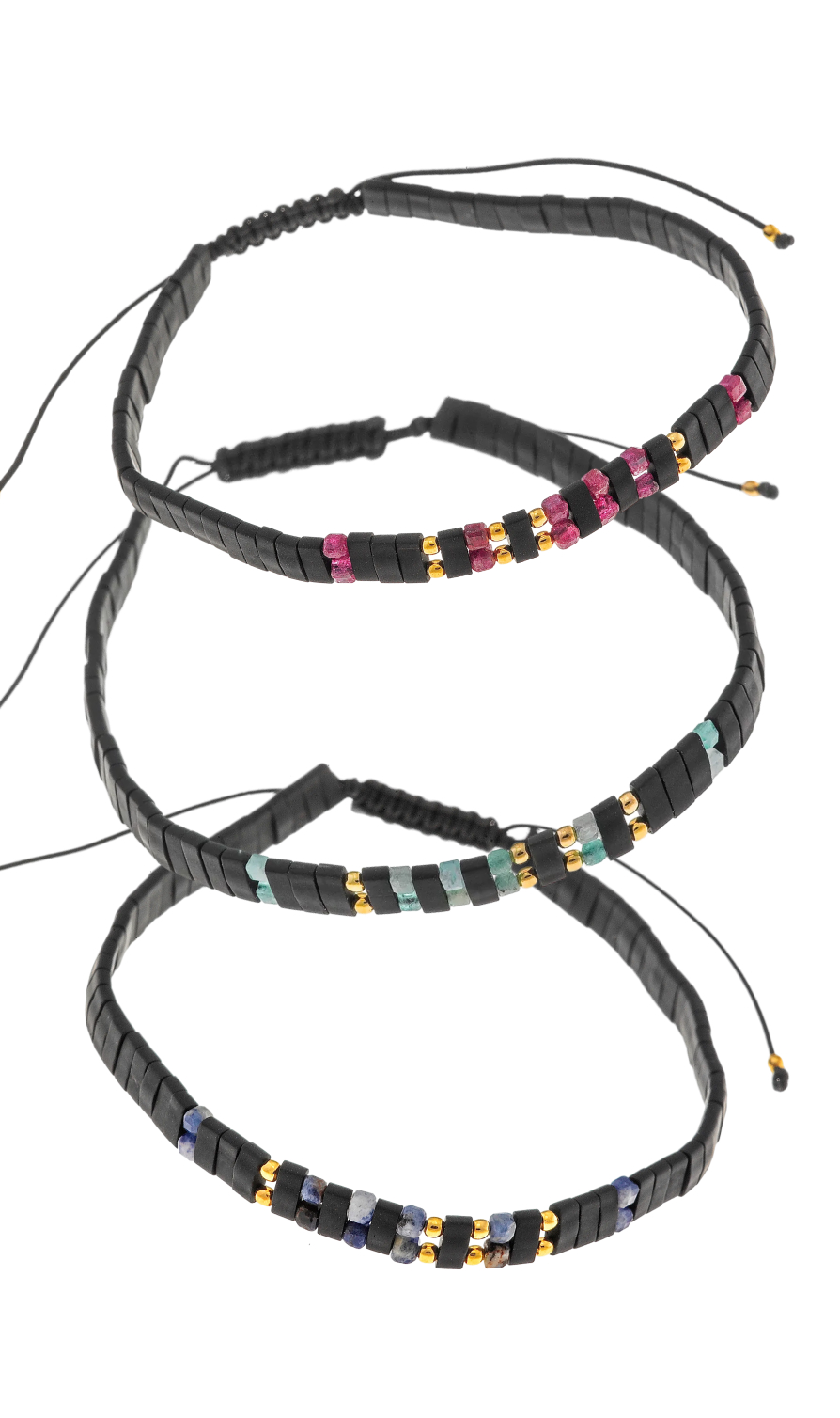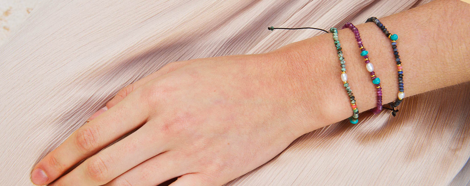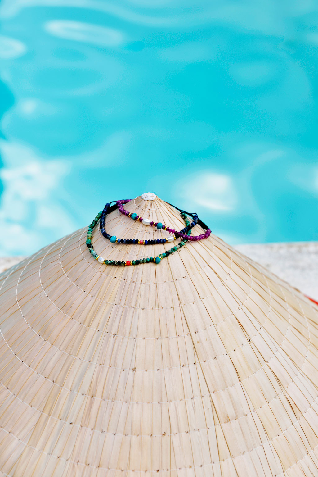 La cápsula más deseada del verano, pensada para todxs. Pulseras de hilo con piedras naturales donde destacan turquesas, zafiros y rubies, con perlitas y apliques de plata bañada en oro que evocan viajes improvisados, carreteras, siestas junto al mar y ese modo libre de llevar las joyas cuando el verano dicta el ritmo.
